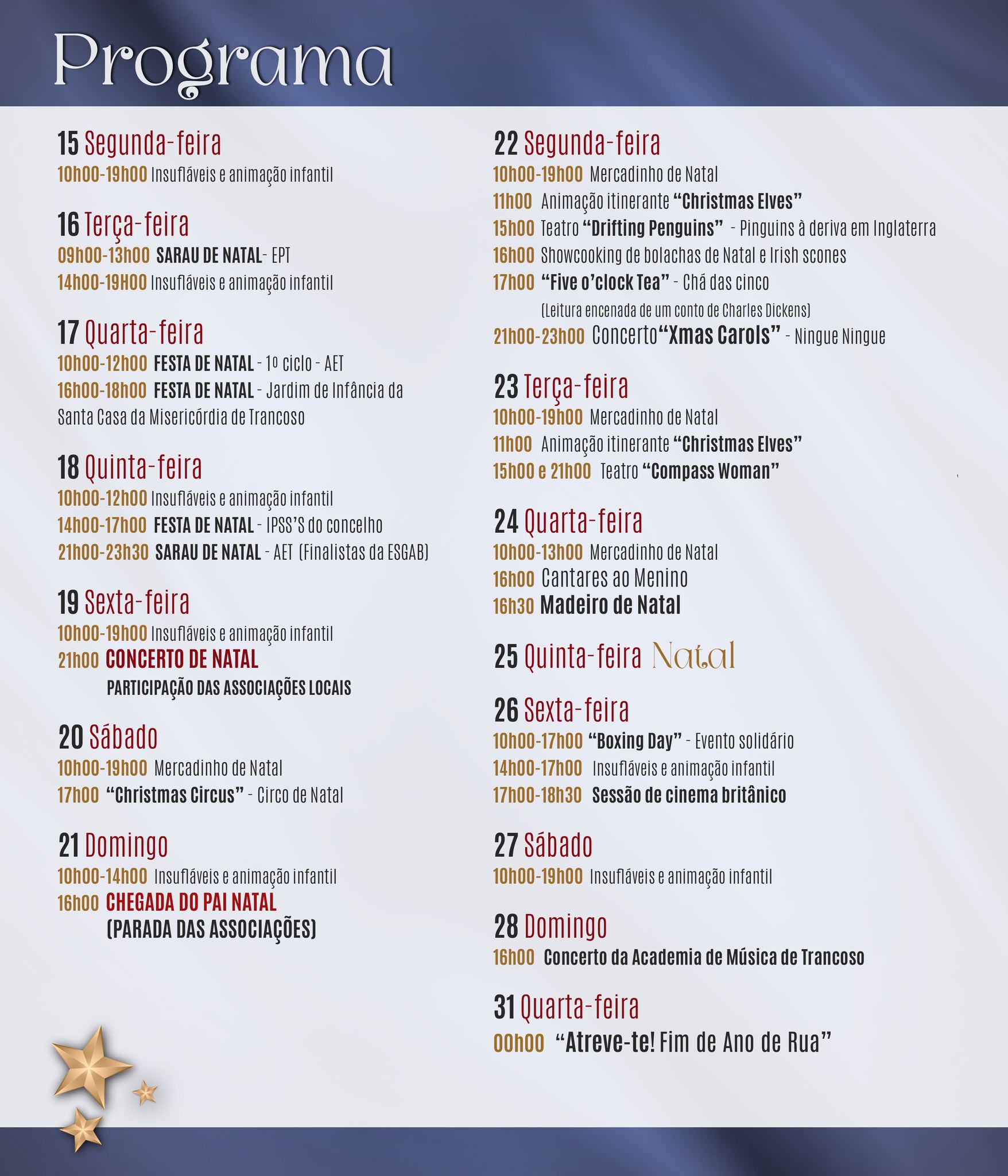 De 15 a 31 de dezembro, o centro histórico de Trancoso recebe o evento “Magia de Natal”, com uma programação lúdico-cultural diversificada e dirigida a públicos diferenciados.