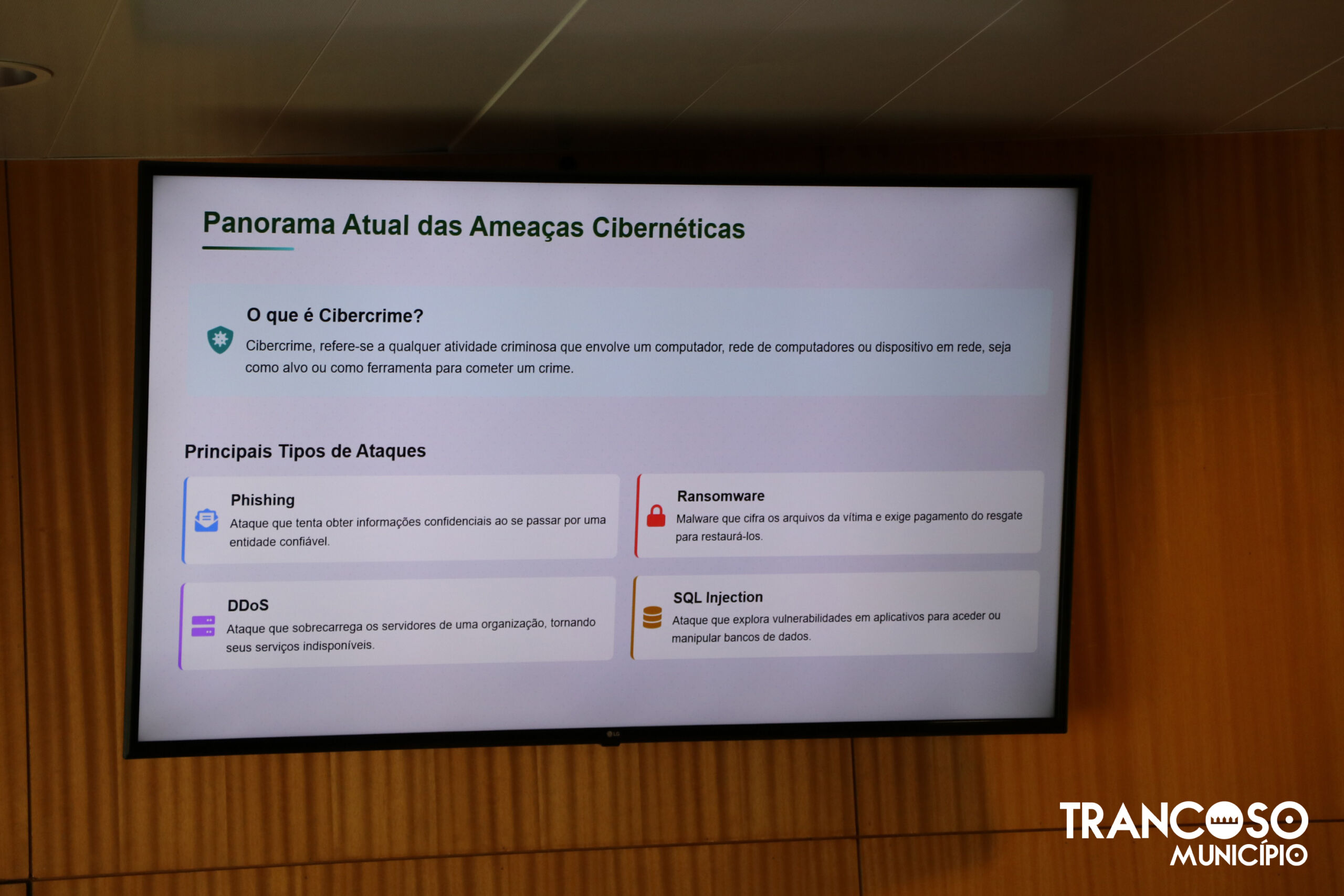 Durante a sessão foram abordados temas como prevenção de ataques informáticos, segurança de dados, boas práticas no uso de sistemas informáticos e medidas essenciais para mitigar vulnerabilidades tecnológicas.
