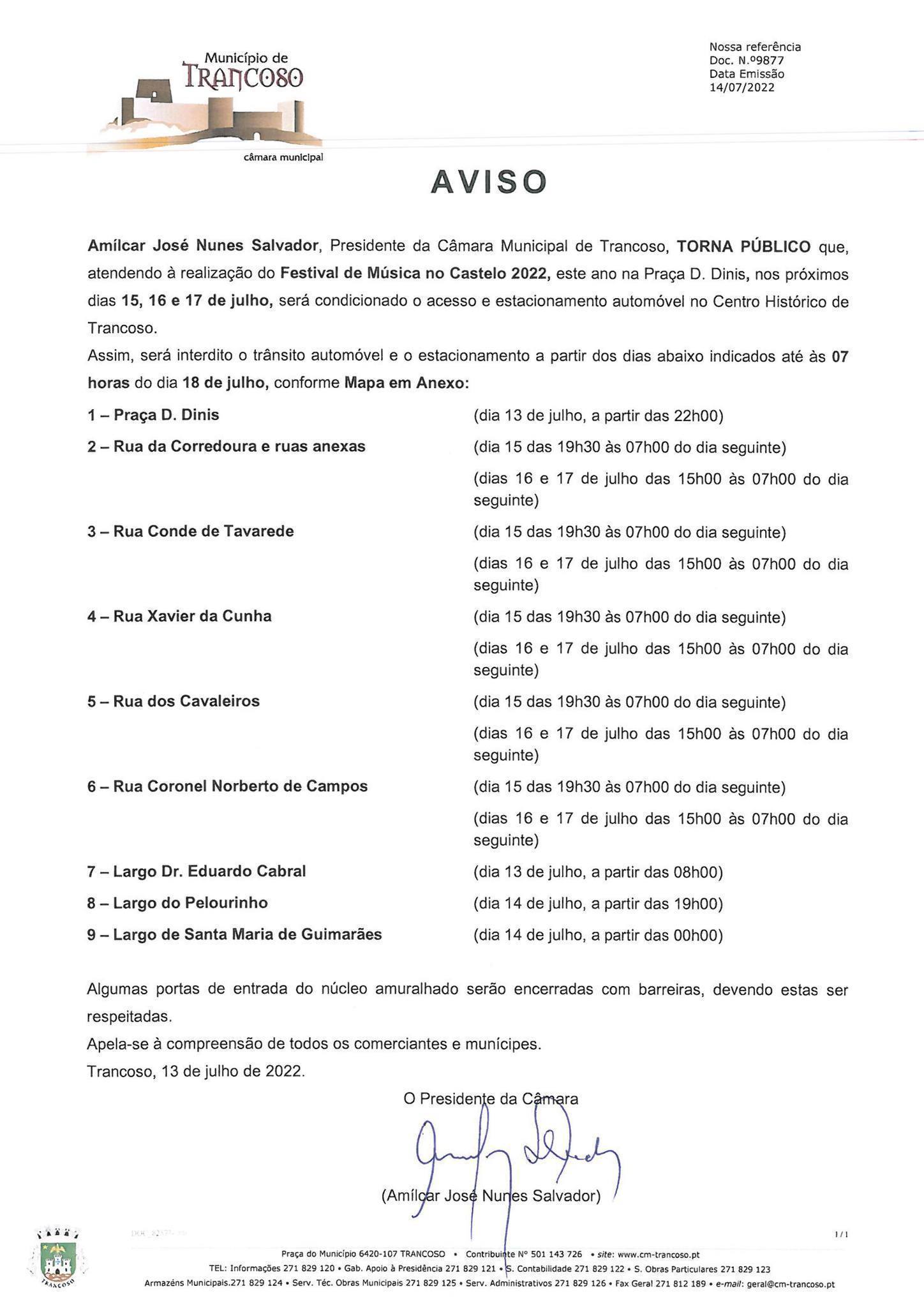 Atendendo à realização do Festival de Música no Castelo 2022, a realizar na Praça D. Dinis nos dias 15, 16 e 17 de julho será condicionado o acesso e estacionamento automóvel no Centro Histórico de Trancoso.